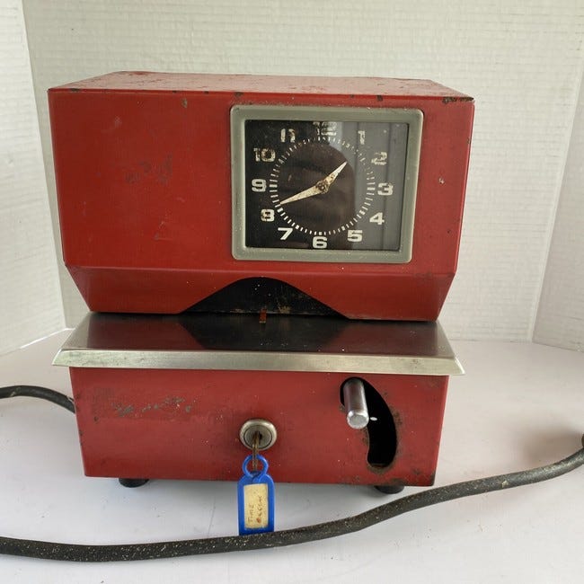 The break room was a symphony of the humming microwave, idol chit chat, and the humming of florescent lights. Maya looked around, as she ate her chicken salad sandwich. That’s where she saw the old time clock, sitting in the corner. “What’s up with the old time clock?” Maya watched the color leave Johan’s face.